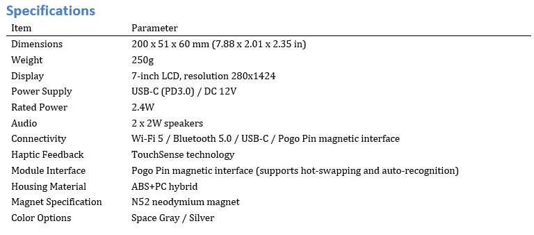 Universal Connection Center (The Hub): Provides wired (custom magnetic contacts) and wireless (Bluetooth Low Energy Mesh) interfaces; built-in high-speed CAN bus ensures high-speed lossless data flow between CoreBar and modules.