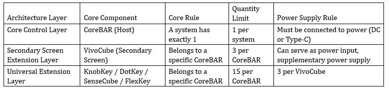 3. Unified Extension Logic: Whether host or slave, each CoreBAR (primary/slave) can connect up to 15 modules; each VivoCube slave can connect up to 3 modules.