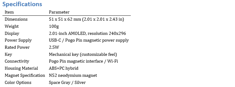 Infinite Flexible Visual Display: Equipped with a 2.0-inch high-resolution AMOLED display, with completely dynamic programmable display content (such as text, icons, dynamic weather, or audio spectrum analyzer).
