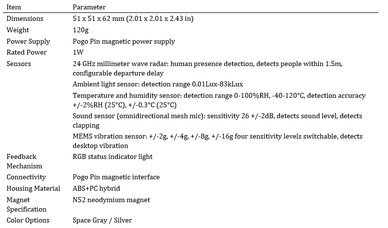 SenseCube is the environmental intelligent perception core of the system. It can actively perceive environmental changes and user presence, endowing the desktop with vision, touch, and temperature sensing.